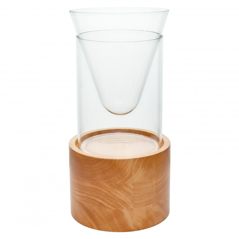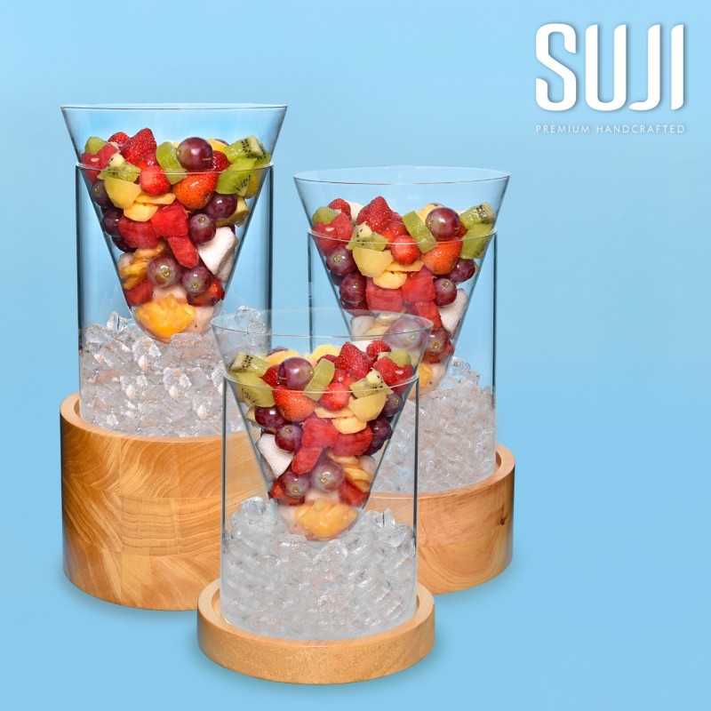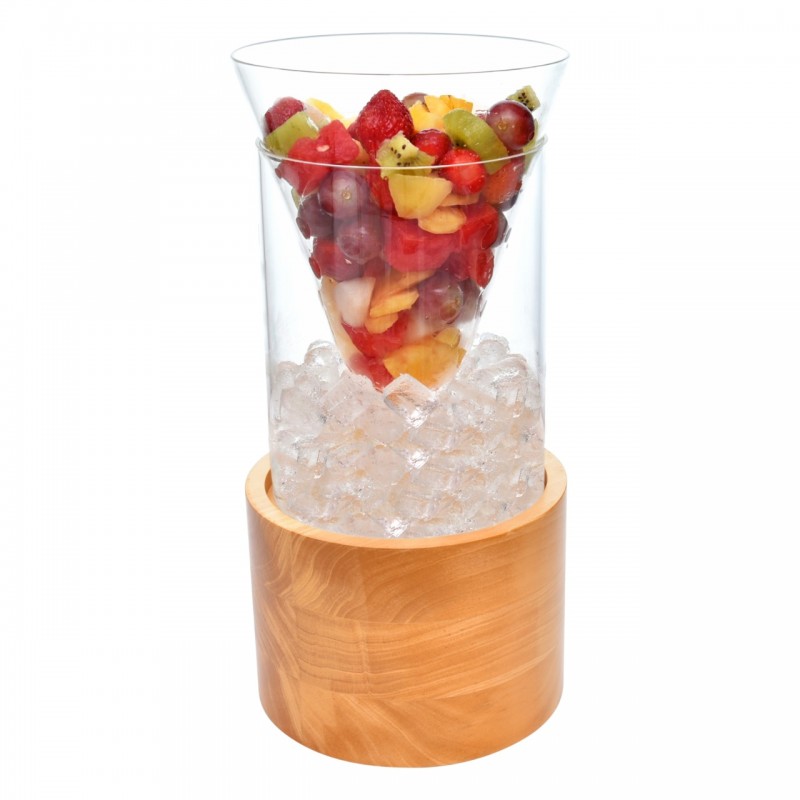 Gelas buah ini berfungsi agar selama disajikan, buah bisa tetap dingin. Display chiller buah ini terdiri dari 3 bagian : gelas, wadah es, dan tatakan kayu.